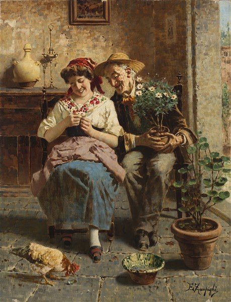 Eugenio Zampighi "M'ama non m'ama" olio su tela (cm 59,5x45,5) Firmato in basso