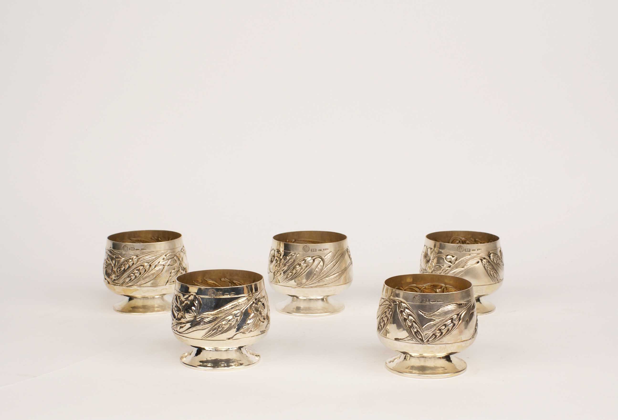 CINQUE BICCHIERI IN ARGENTO Firenze Brandimarte Sbalzati a motivo di spighe di grano con interno in vermeil Peso 720 gr.