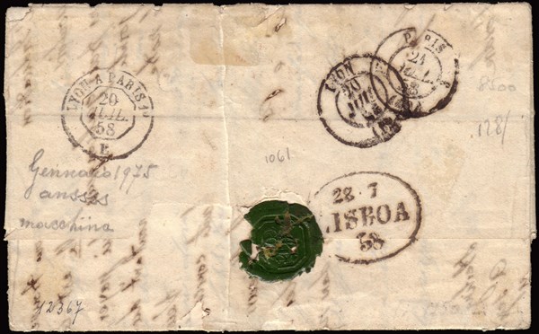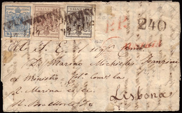 Lettera con testo da Treviso, via di Austria e Francia, per Lisbona (Portogallo), affrancata per 85c. con 10c. nero, 30c. bruno e 45c. azzurro. Il francobollo da 10c. presenta un taglio lungo il margine verticale sinistro che sfiora la vignetta