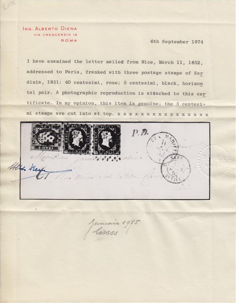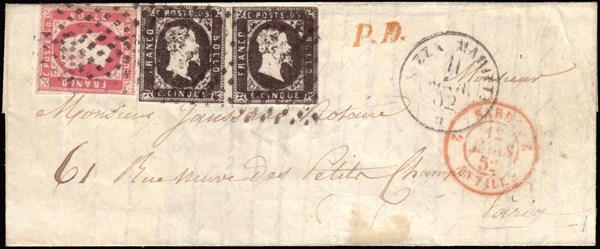Lotto 5 | SARDEGNA 1852 ( 11 mar.) Lettera con parte di testo da Nizza per Parigi affranc