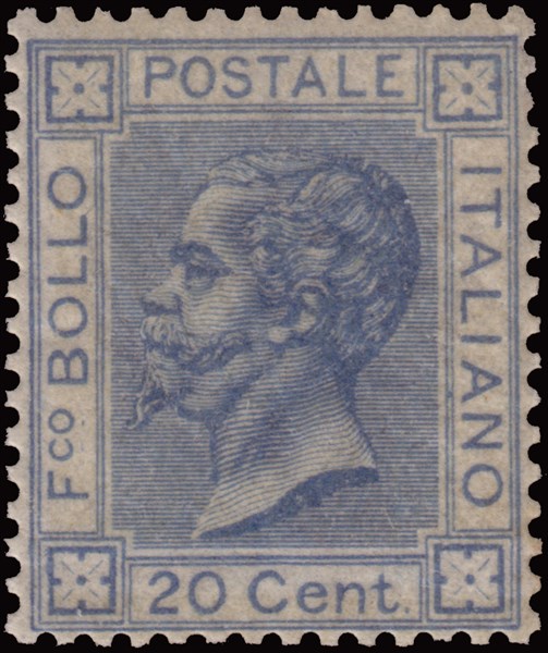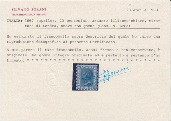 REGNO D'ITALIA 1867 20c. azzurro lillaceo chiaro, tiratura di Londra Cert. S.