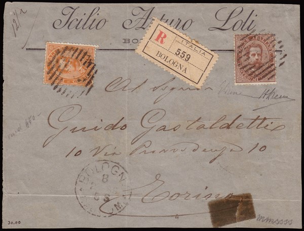 Frontespizio di lettera raccomandata da Bologna per Torino, affrancata per 50c. con 20c. arancio e 30c. bruno