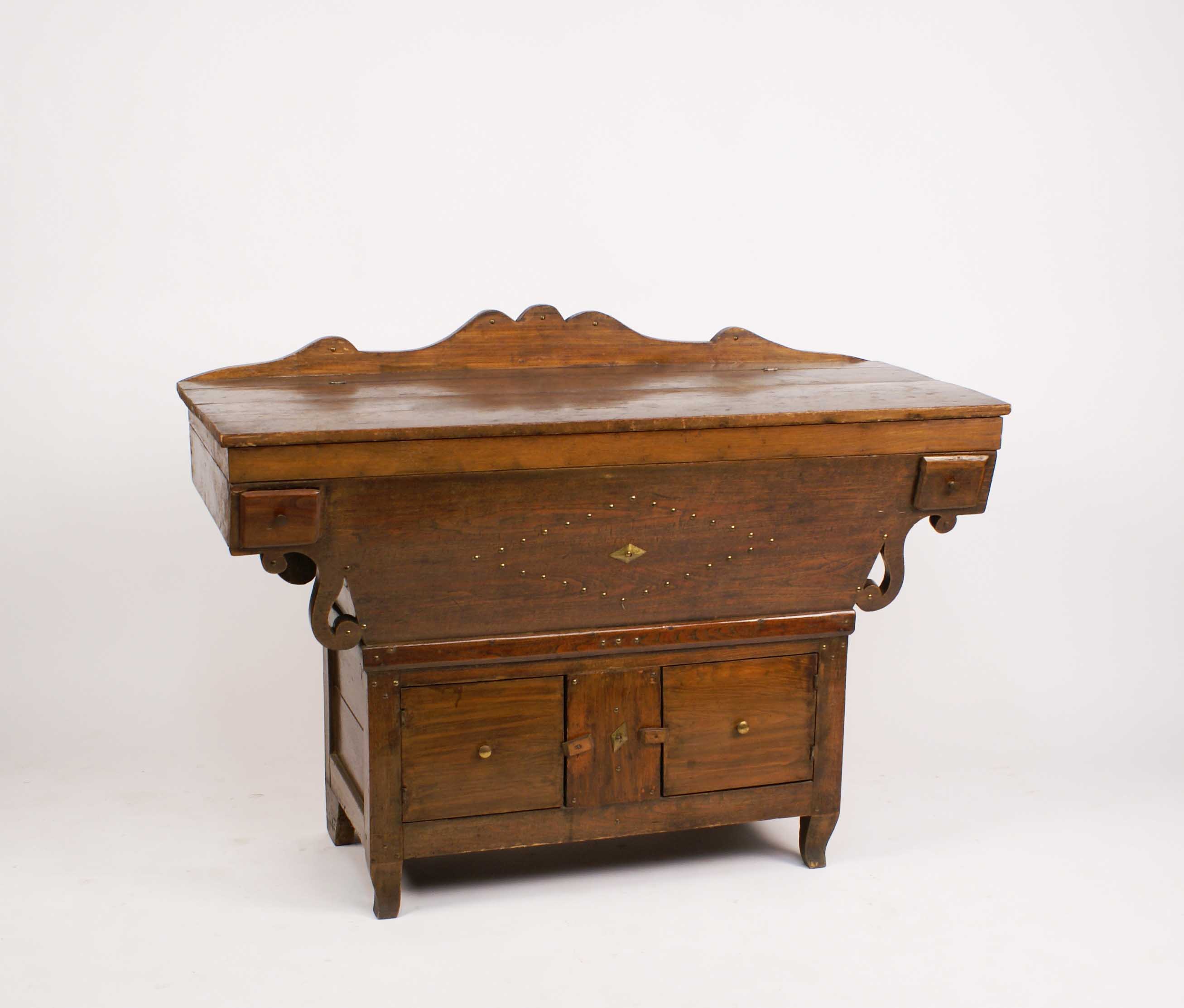 MADIA IN ROVERE Spagna fine del XIX Sec. Piano rettangolare apribile con due tiretti e due sportelli sottostanti ed applicazioni in metallo dorato Dim. 91x125x54 cm.
