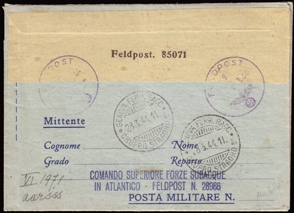 Serie completa di 6 valori, soprastampati "Répubblica / sociale / Italiana / / Base Atlantica" su biglietto postale per Genova. Al verso segni di censura tedesca e timbro "COMANDO SUPERIORE FORZE SUBACQUE / IN ATLANTICO - FELDPOST N. 28986"