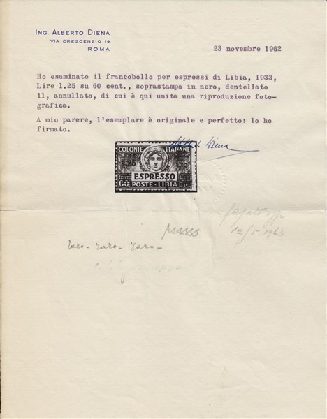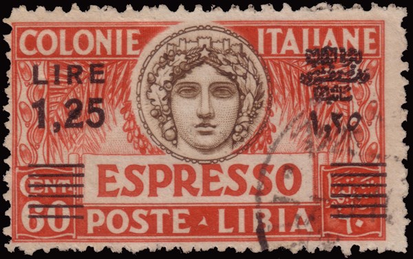 Lotto 29 | LIBIA 1933 Espresso. 1,25 lire/60c. carminio scuro e bruno, soprastampa nera P