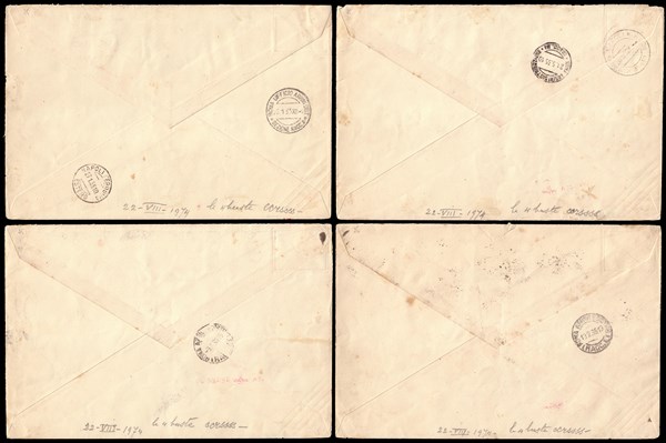 Posta aerea "Roma-Mogadiscio". Serie completa di 10 valori di Eritrea, Cirenaica, Somalia e Tripolitania su 4 buste viaggiate per Roma