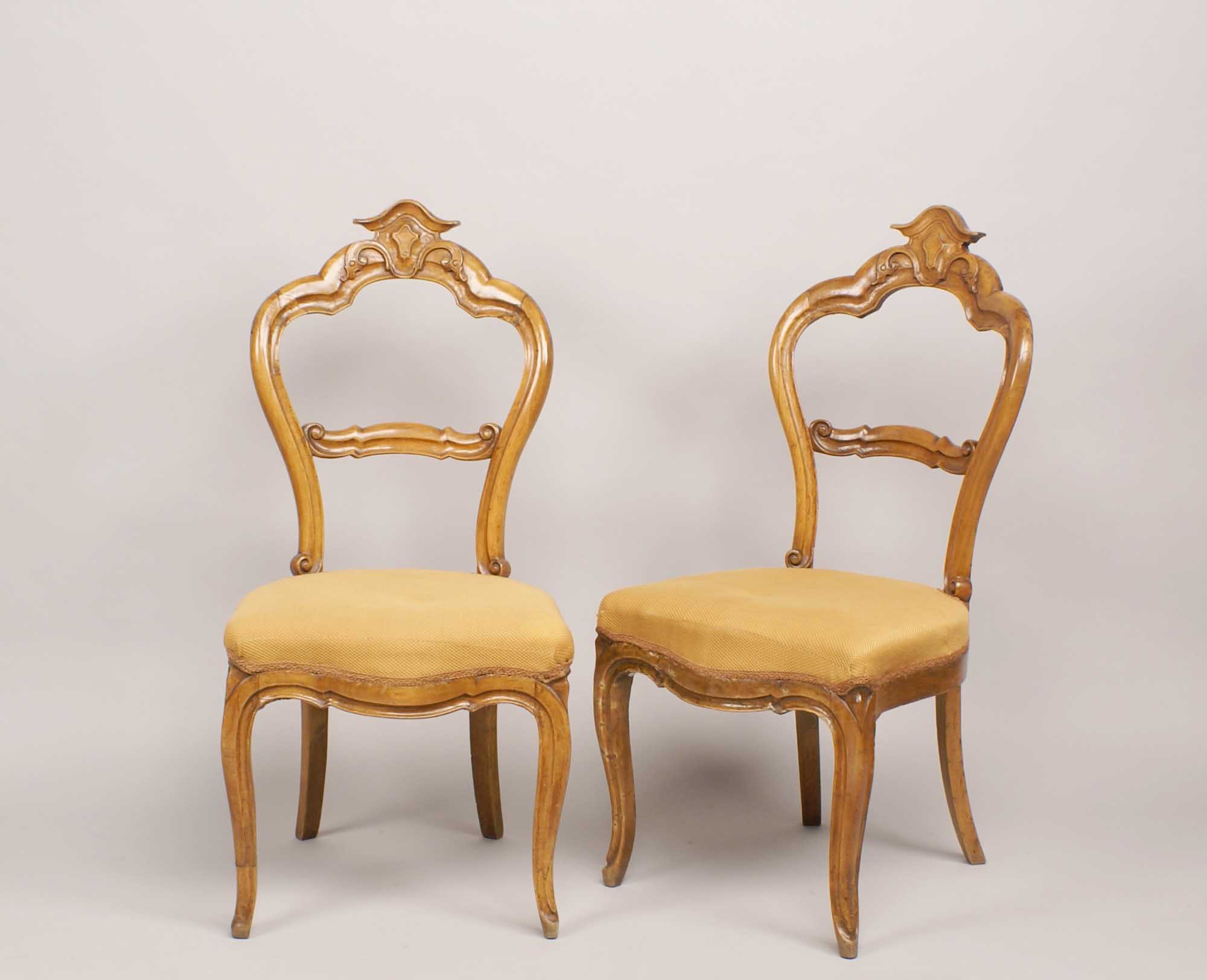 COPPIA DI SEDIE IN NOCE INTAGLIATO fine del XIX Sec. Schienali a giorno con sedute in tessuto, (restauri) H. 96,5 cm.