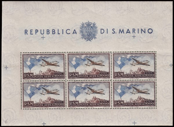 SAN MARINO 1951 Foglietto posta aerea. 1000 lire "Bandiera, aereo e veduta". Al