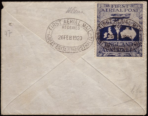 Posta aerea, raid "Inghilterra-Australia", pilota Ross Smith. Busta, con testo accennante il volo, trasportata dall'Inghilterra all'Australia e ritorno, con vignetta/francobollo commemorativa al verso, timbrata "FIRST AERIAL MAIL - GREAT BRITAIN TO AUSTRALIA / RECEIVED 26 FEB 1920". Sul fronte timbro lineare violetto "PER / VICKERS "VIMY" AEROPLANE / TO AUSTRALIA". La vignetta/francobollo venne stampata a Melbourne ed emessa gratuitamente dalle poste australiane