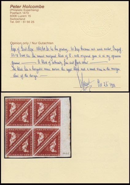 1d. rosso carminio scuro (deep carmine-red), tiratura De la Rue, blocco di otto, bordo di foglio. Leggera piega naturale della carta