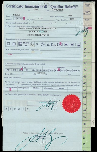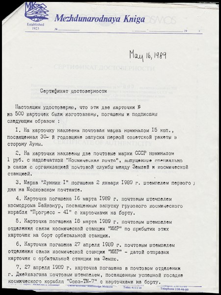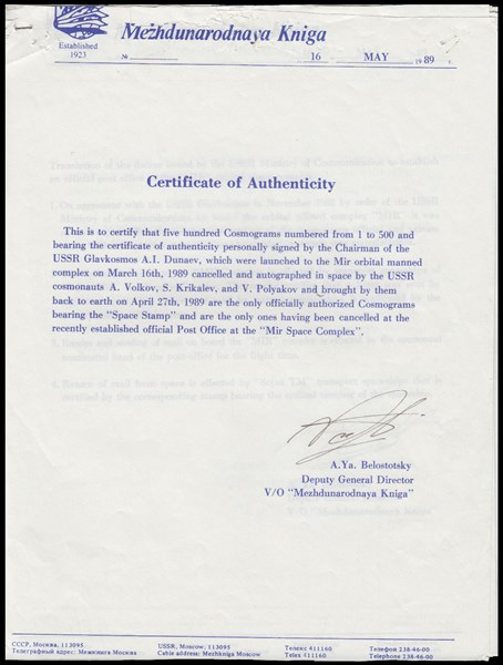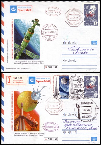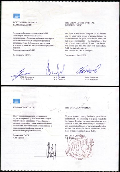 Stazione orbitale MIR, i due cosmogrammi Progress 41-Mir-Soyuz TM-7 di andata e ritorno, n.003 di 528 affrancati con francobollo da 1 rublo con soprastampa in rosso "Posta Spaziale", e timbri vari sia apposti a terra che a bordo della stazione orbitante. Al verso del cosmogramma di ritorno firme autografe dell'equipaggio a bordo della Mir: Krikalev, Volkov, Polyakov
