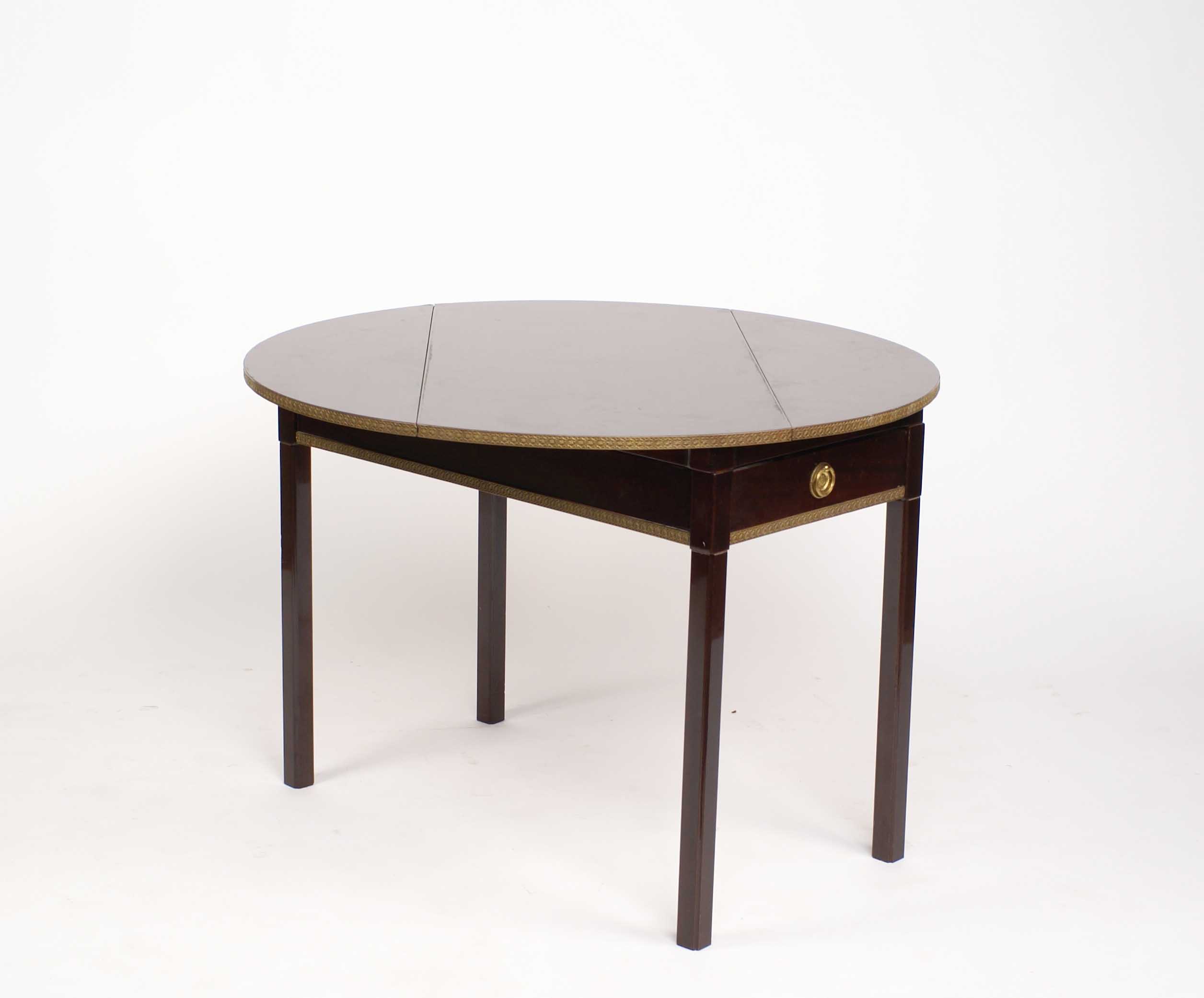 TAVOLINO A BANDELLE IN MOGANO vecchia manifattura Piano girevole con applicazioni in bronzo dorato e due cassetti sulla fascia, cm.73x70x45 (chiuso) cm.73x70x90 (aperto)