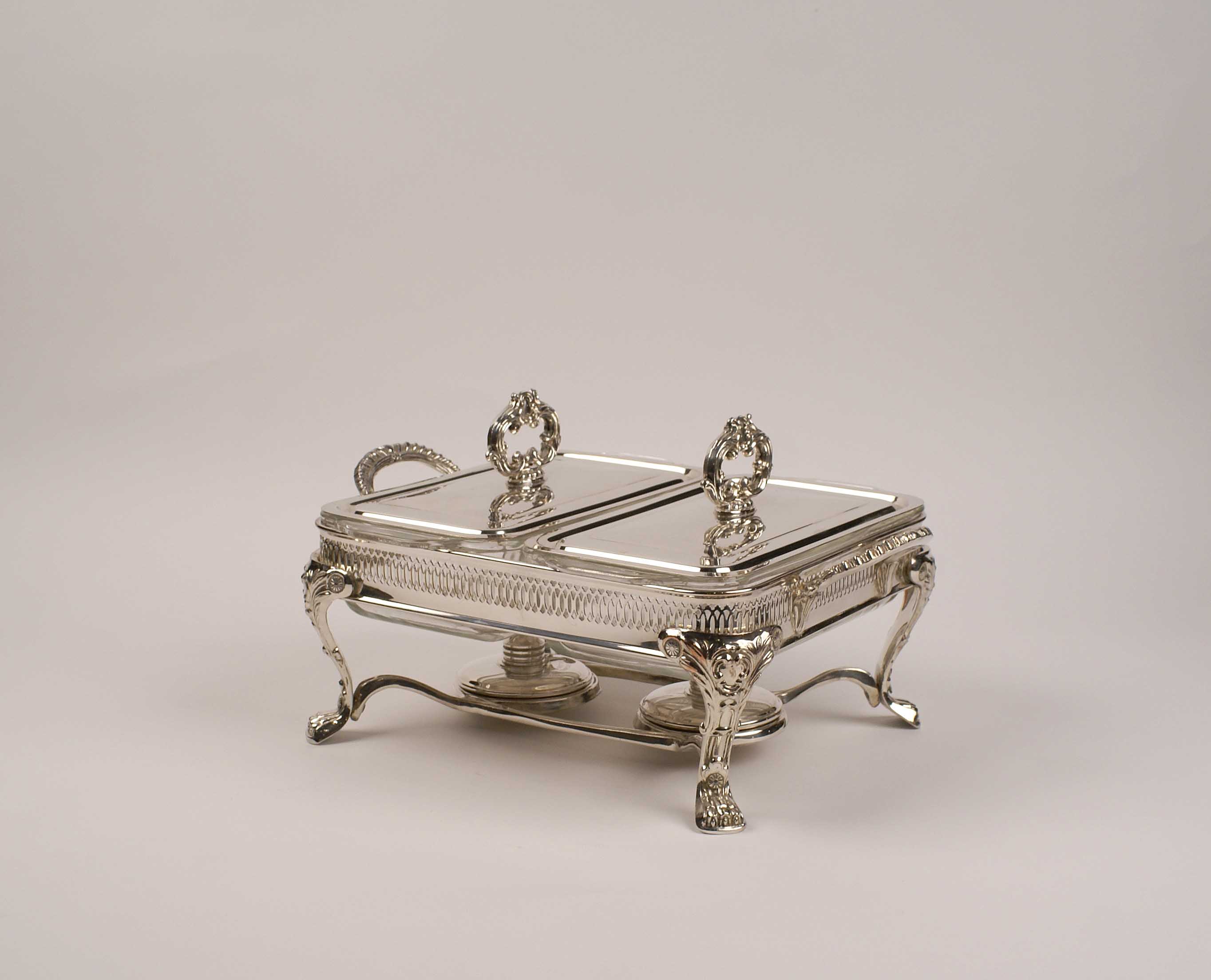 LEGUMIERA DOPPIA IN METALLO Stati Uniti vecchia manifattura Con interni in pyrex e relativi scaldini Dim. 20x36x27 cm.