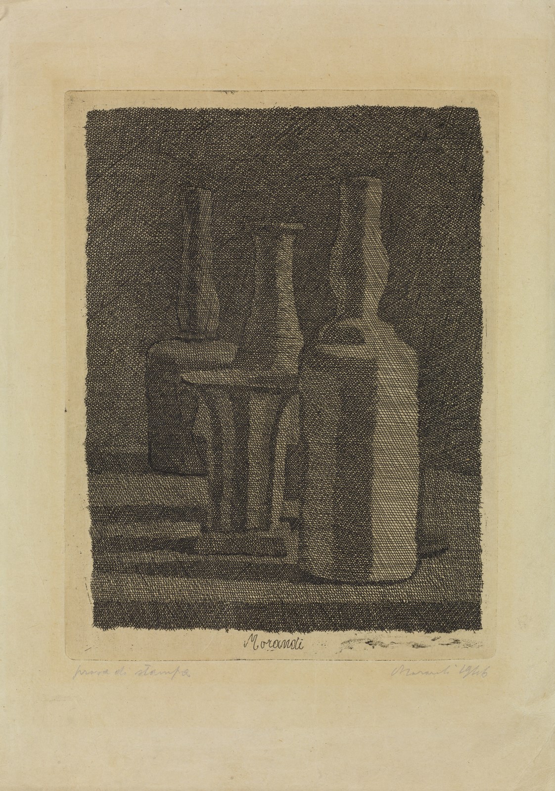 MORANDI GIORGIO (1890 - 1964) Natura morta con vasetto e tre bottiglie. 1946. Acquaforte su carta giappone. Cm 13,30 x 17,30. P.d.a. Tiratura, firma e anno in basso a matita. Firma in basso al centro in lastra. Dimensione foglio: 24.8x17,3 cm. Edizioni del Milione (timbro al retro), Milano. Tracce di colla e cartone al retro in corrispondenza del margine superiore. Bibliografia: Vitali, n.112.