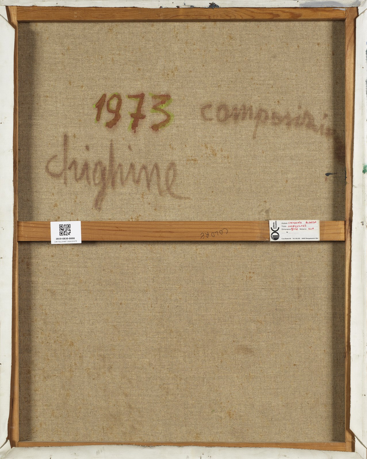 CHIGHINE ALFREDO (1914 - 1974) Composizione. 1973. Olio su tela . Cm 65,00 x 81,00. Al retro titolo, firma, anno e cartiglio descrittivo Galleria l'Incontro, Borgomanero. Pubblicazione: "Ajmone, Cappelli, Cazzaniga, Della Torre, Forgioli, Lavagnino, Morlotti, Pedrina, Savinio", Galleria l'Incontro, Borgomanero, Aprile 1974, tav.8; Elisabetta Longari - Cristina Casero, "Chighine", mostra personale dell'artista, Galleria Marini, 2015, Milano.