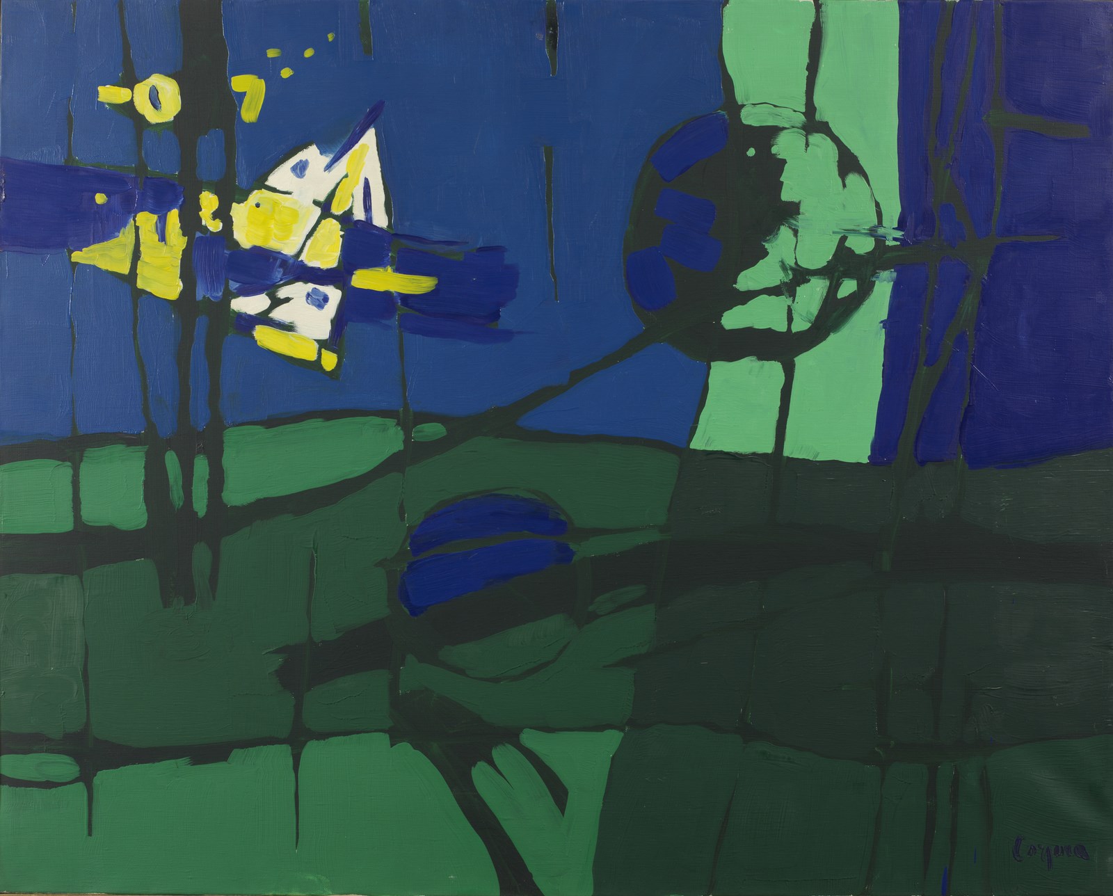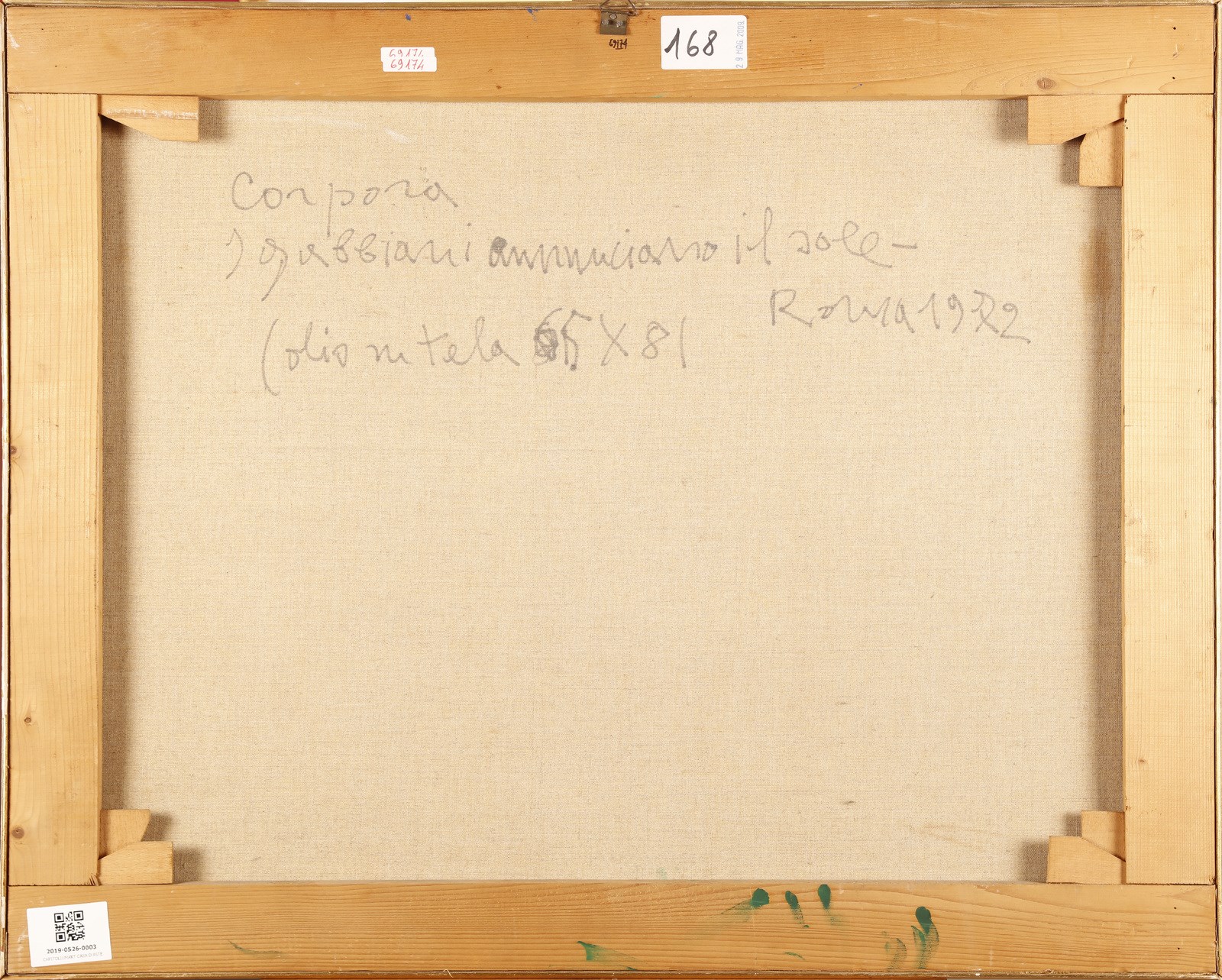 CORPORA ANTONIO (1909 - 2004) I gabbiani annunciano il sole. 1972. Olio su tela . Cm 80,00 x 65,00. Firma in basso a destra. Al retro titolo, firma e anno. Autentica su fotografia di Giovanni Di Summa, Archivio Antonio Corpora. Pubblicazione: Catalogo Generale Antonio Corpora - Il tempo scintillante a cura di Floriano De Santi, III Volume (di prossima pubblicazione). Presenti difetti.