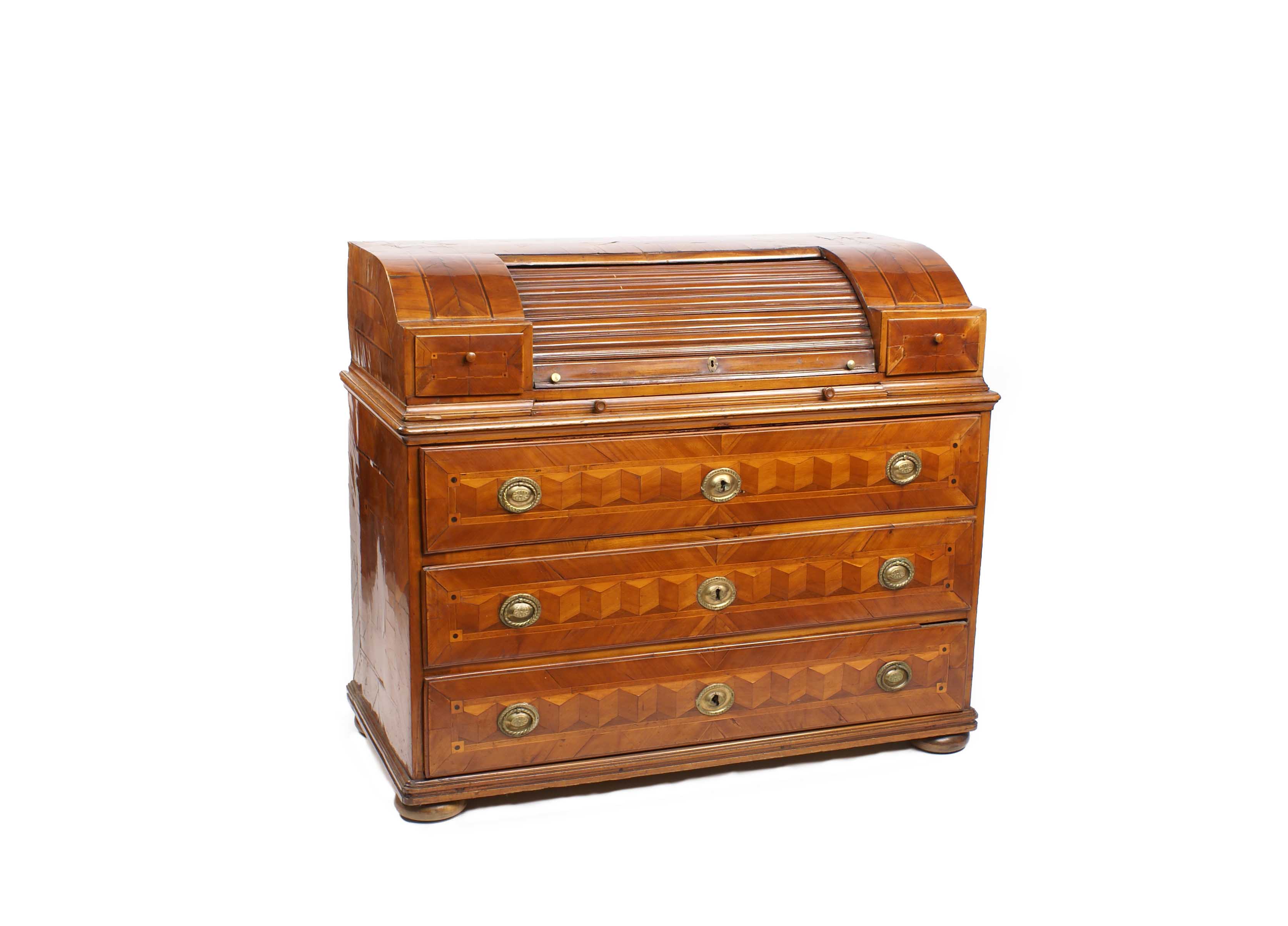 PARTICOLARE MOBILE RIBALTA IN CILIEGIO A DUE CORPI Germania fine del XVIII secolo Intarsiato e filettato a motivi geometrici in legni di frutti, parte superiore con calatoia a serrandina celante tiretti vari con tablette e due cassetti ai lati, parte inferiore a tre cassetti, piedi a cipolla Dim. 104x123x60 cm.
