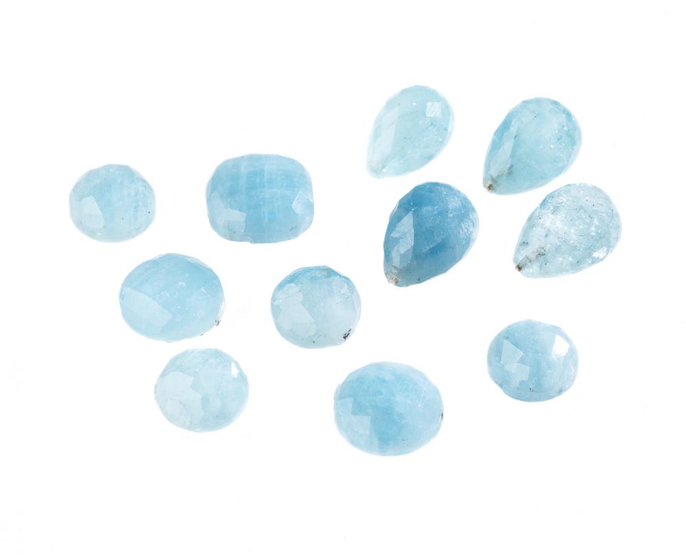 LOTTO DI UNDICI ACQUEMARINE di forme a goccia, ovale e rotonda, taglio...