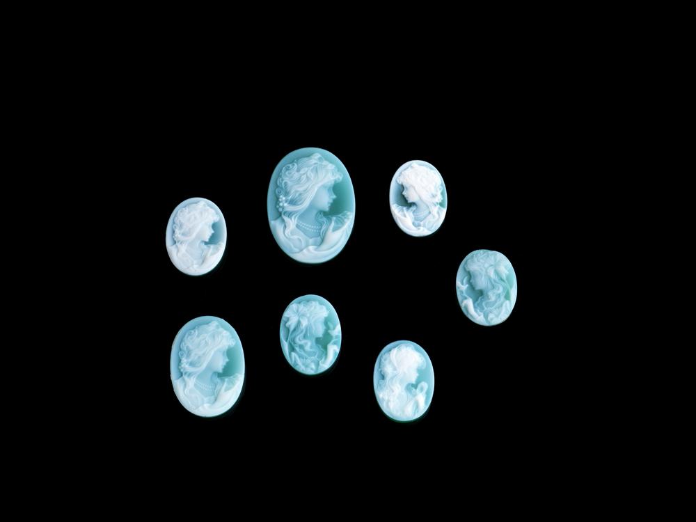 di forma ovale intagliati a profili muliebri, cinque con dimensioni mm 20x14, uno di mm 25x18, uno di mm 30x22, g 13 complessivi