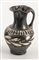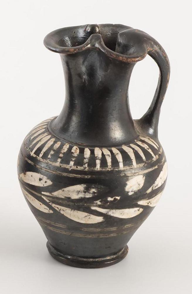 Piccola oinochoe a bocca trilobata pronunciata da due apicature, alto collo troncoconico a profilo concavo distinto dal corpo ovoide, piede ad anello, ansa a nastro impostata verticalmente dallorlo alla spalla