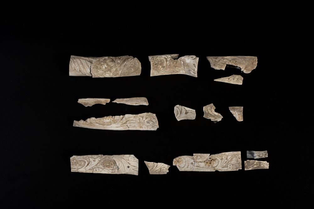 Gruppo di quindici frammenti in avorio ed osso, intagliati a motivi fitomorfi e con piccoli fiori a quattro petali e parzialmente ricoperti in foglia d'oro, pertinenti probabilmente al rivestimento di un cofanetto