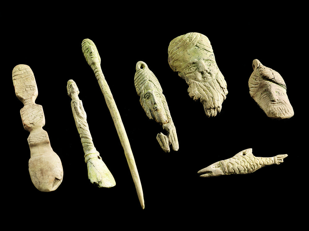 Tre pendenti modellati a testa maschile barbata, un pendente in forma di pesce, un ago crinale con testa in foggia di volto umano, due spatole modellate a figura umana stilizzata (7)