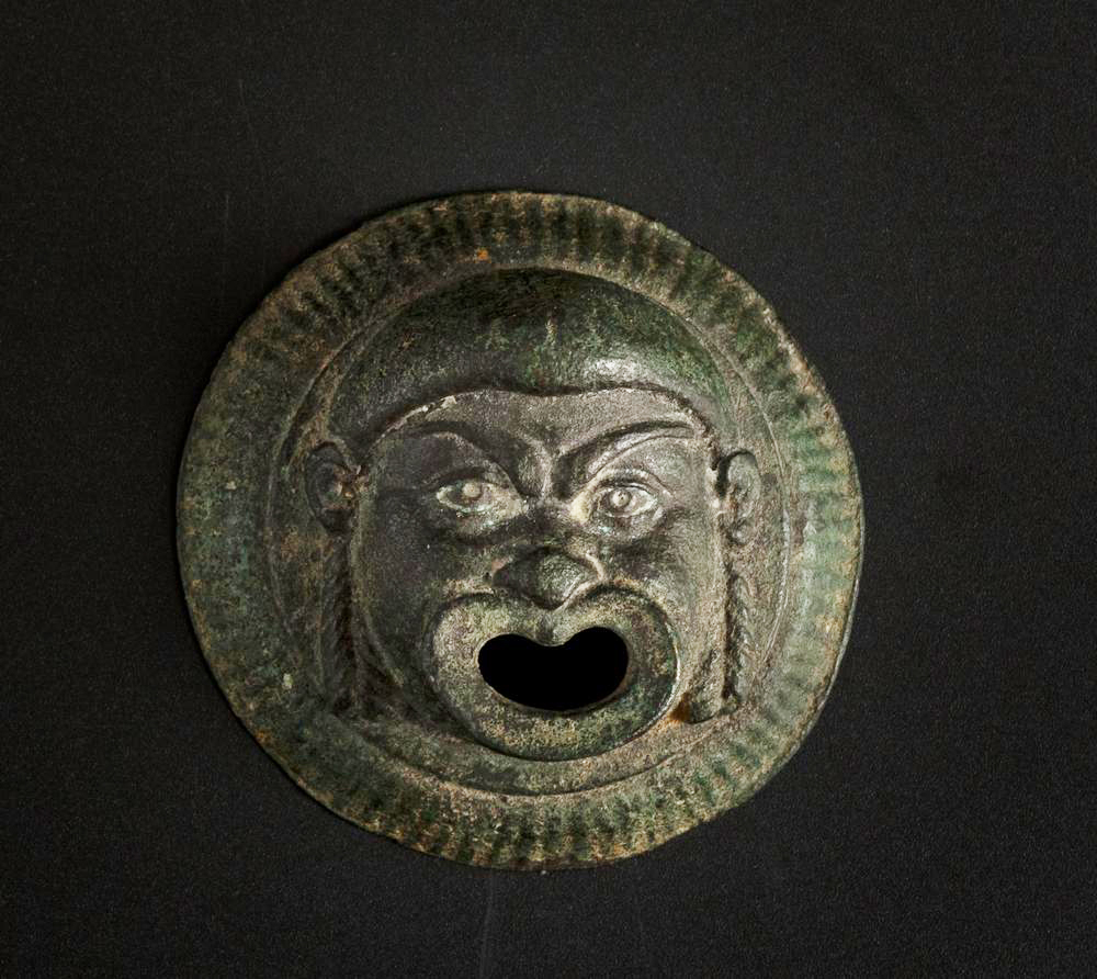 Applique circolare in bronzo raffigurante una maschera teatrale