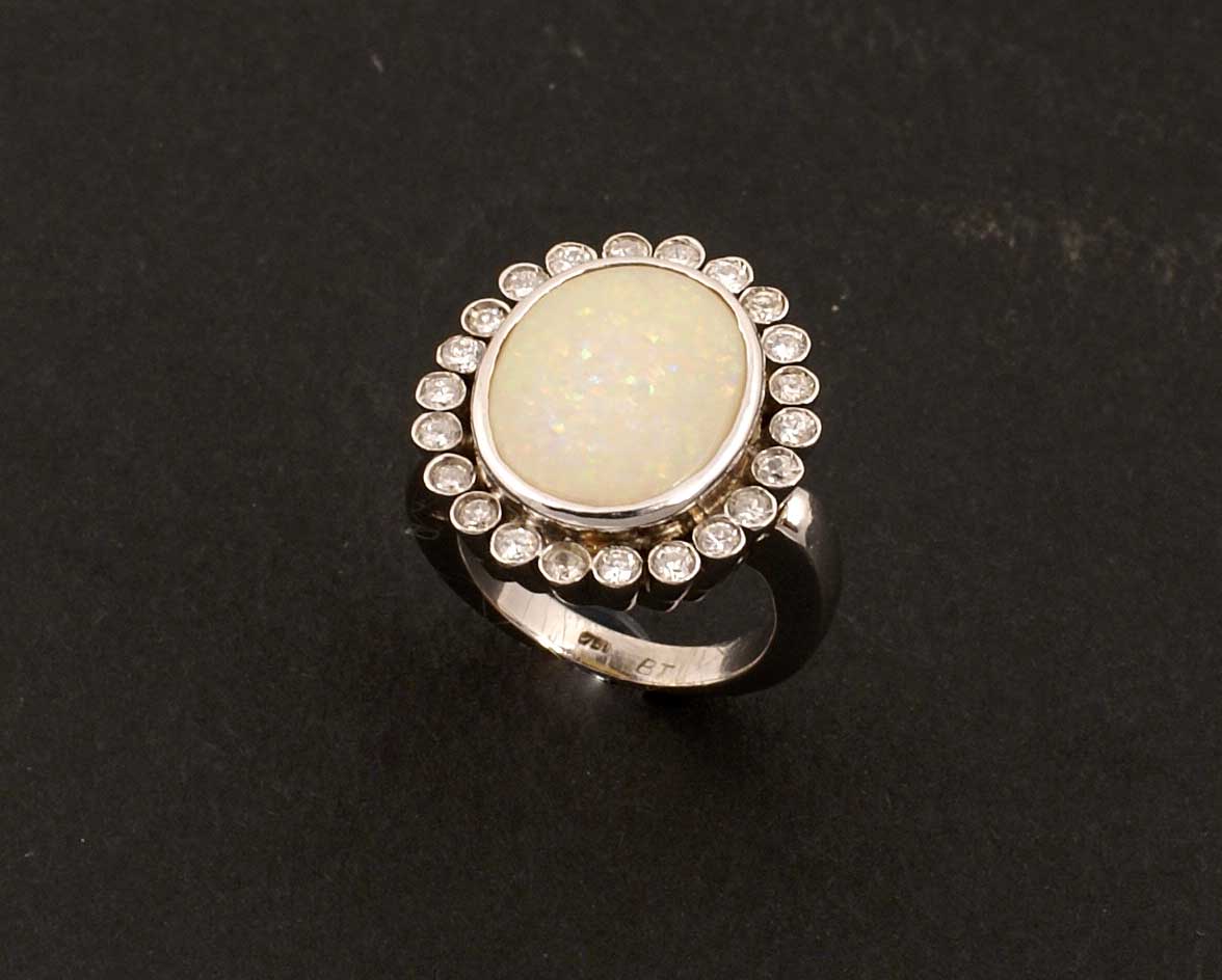 ANELLO IN ORO BIANCO 18KT CON UN OPALE ARLECCHINO anni '40/50 Di forma ovale circondato da diamanti taglio brillante per carati 1 circa Peso 14,2 gr.