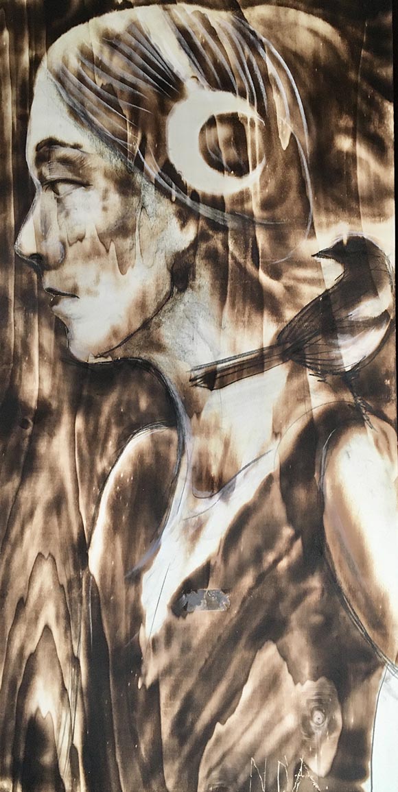 Niko D'Accolti Pittura a fuoco su legno 125x60 Donna 2019 Autentica dell'artista su foto