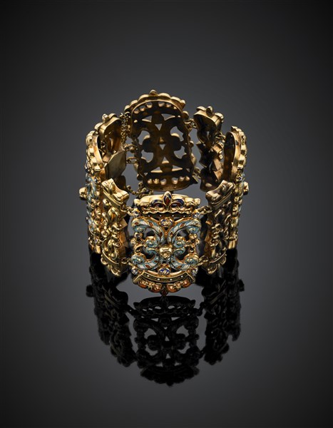 Yellow gold and enamel modular bracelet, g 114.51, length cm 20, width cm 6 circa. (defects)