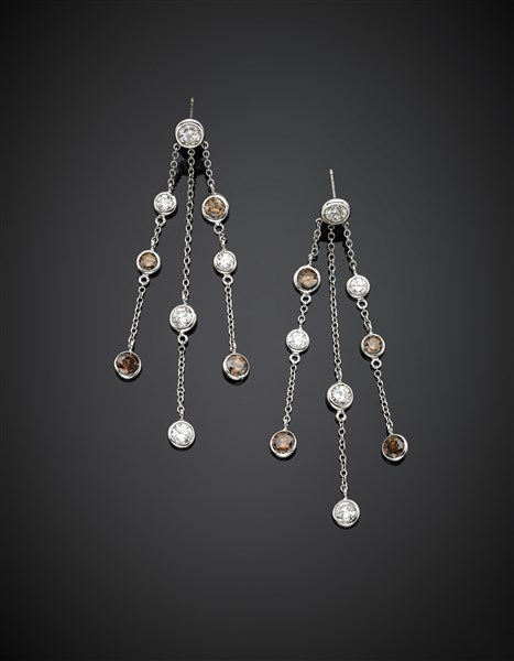Orecchini pendenti con tre catenelle in oro bianco, diamanti incolori per complessivi ct. 3,00 circa e brown per complessivi ct. 3,05 circa, g 11,21, lungh. cm 7,50 circa.