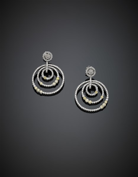 Orecchini pendenti a cerchi concentrici in oro bianco e diamanti incolori e fancy per complessivi ct. 4,15 circa, g 14,97, lungh. cm 4 circa. Con garanzia originale