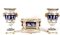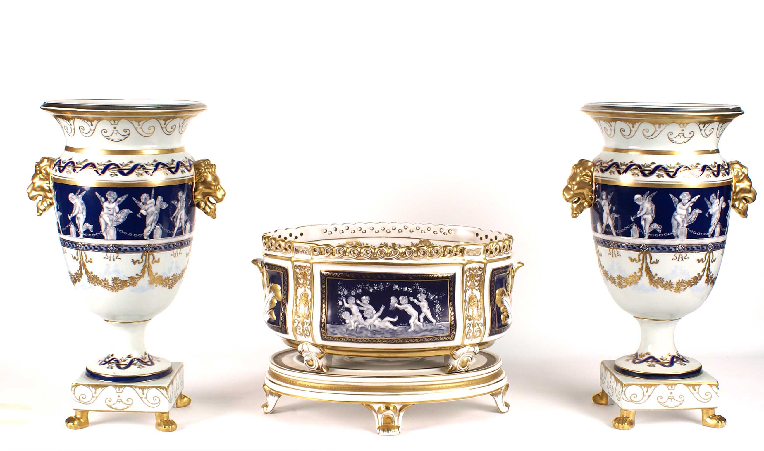 TRITTICO IN PORCELLANA Francia vecchia manifattura Dipinto in policromia e parzialmente dorato decorato a motivo di putti, composto da un centrotavola ovale poggiante su quattro piedini e da due vasi a balaustro su basi squadrate Dim 24x37x24 cm. centrotavola; h. 42 cm. vasi