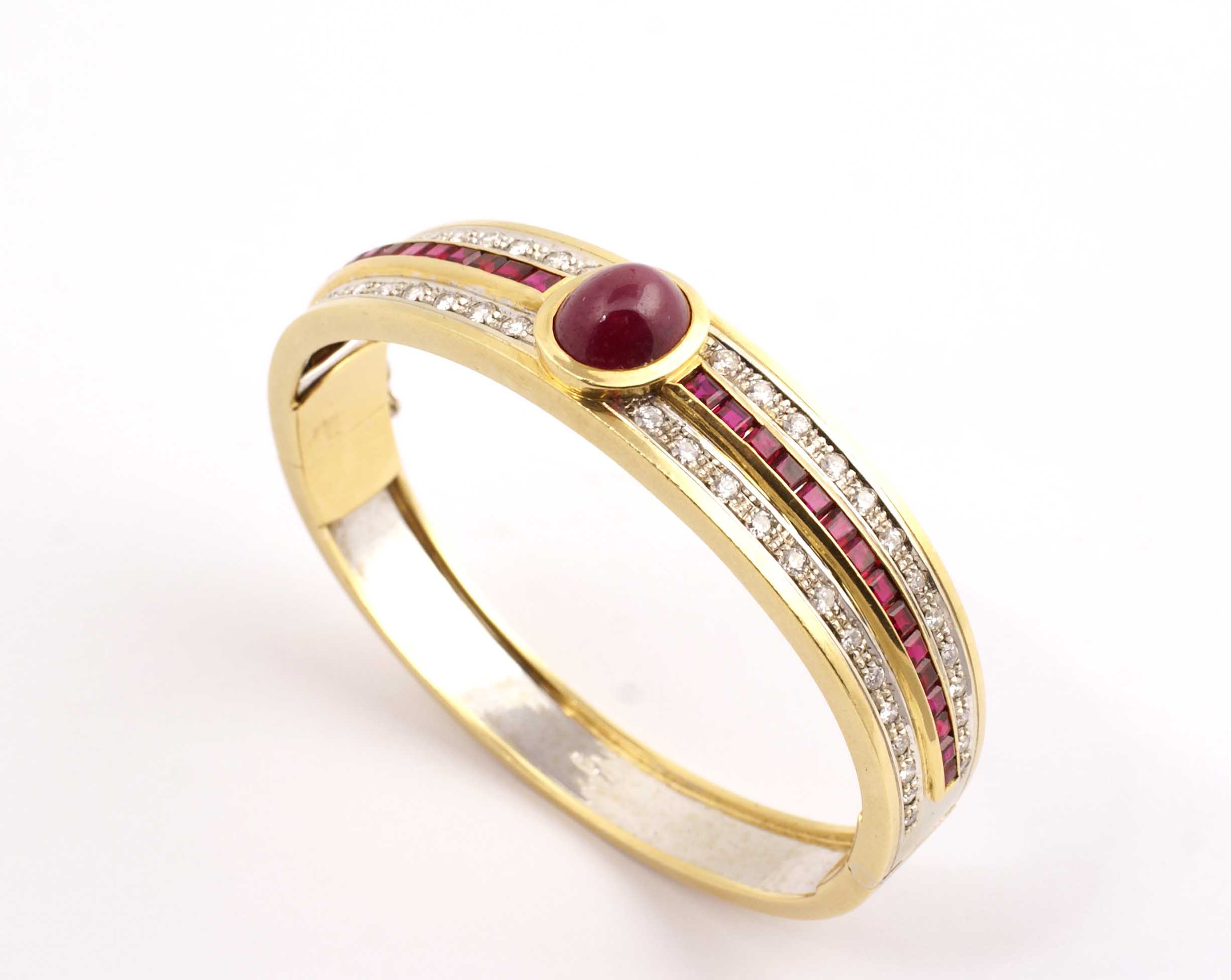 BRACCIALE A MANETTA IN ORO GIALLO E BIANCO 18KT Con rubino cabochon per carati 2,50 circa, diamanti taglio brillante per carati 1,20 circa e rubini carrè per 0,50 punti circa Peso 40,6 gr.