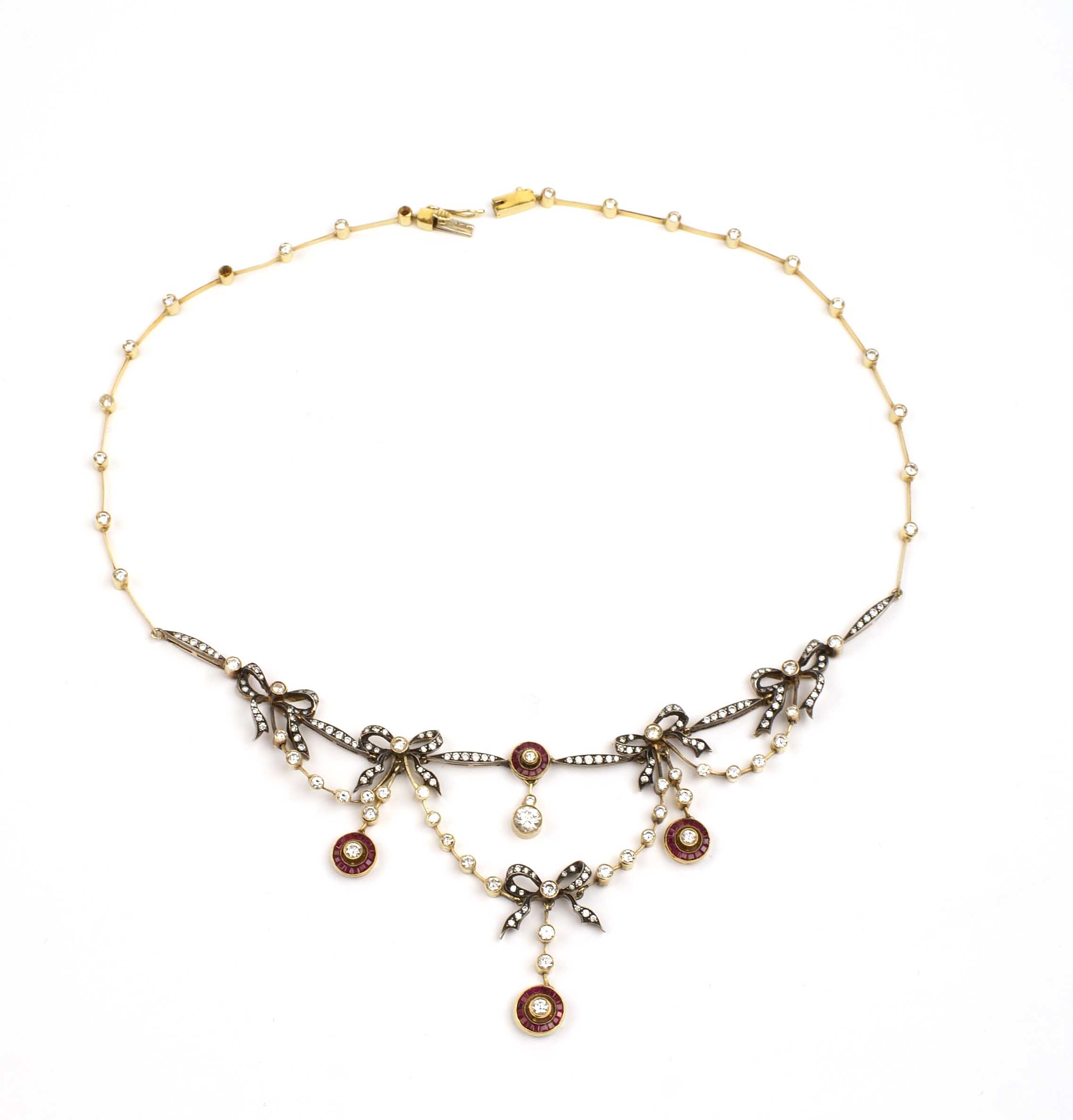 COLLIER A NODI D'AMORE IN ORO GIALLO 18KT E ARGENTO Con diamanti taglio brillante per carati 2 circa e piccoli rubini taglio carrè Peso 24 gr.