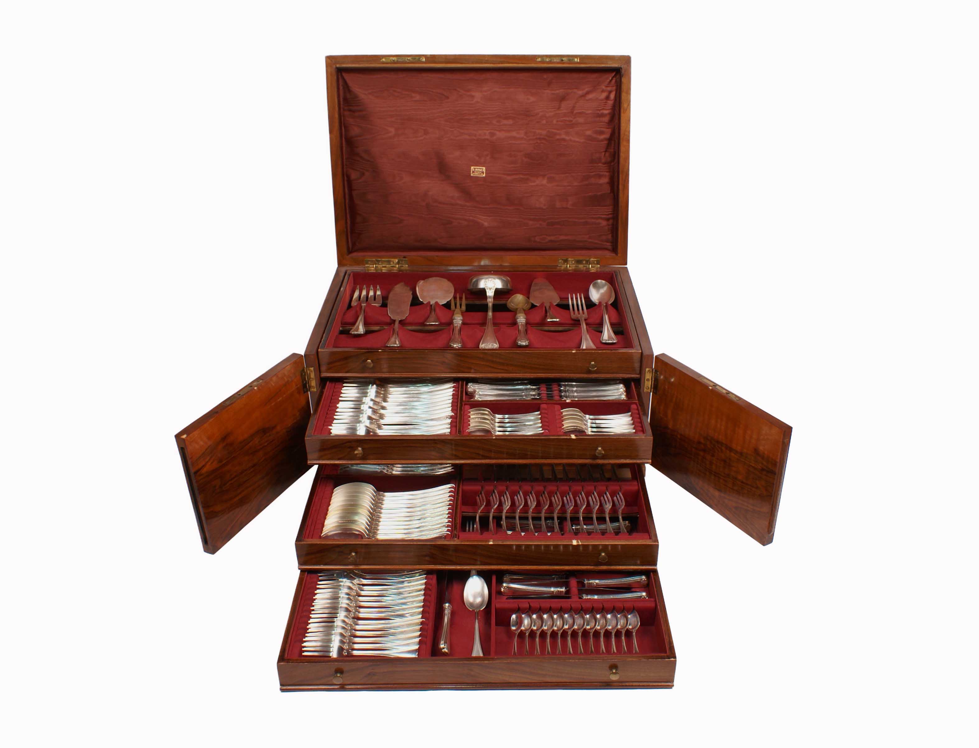 SERVIZIO DI 192 POSATE IN ARGENTO Italia vecchia manifattura Con manici sbalzati e decorati a motivo di conchiglia, composto da 24 forchette, 24 coltelli, 12 cucchiai, 13 cucchiai medi, 25 forchette frutta, 13 coltelli frutta, 12 cucchiaini, 12 forchettine dolce, 12 cucchiaini caffè, 24 forchette pesce, 12 coltelli pesce e 9 posate da portata, entro scatola in legno di noce Peso 8350 gr.