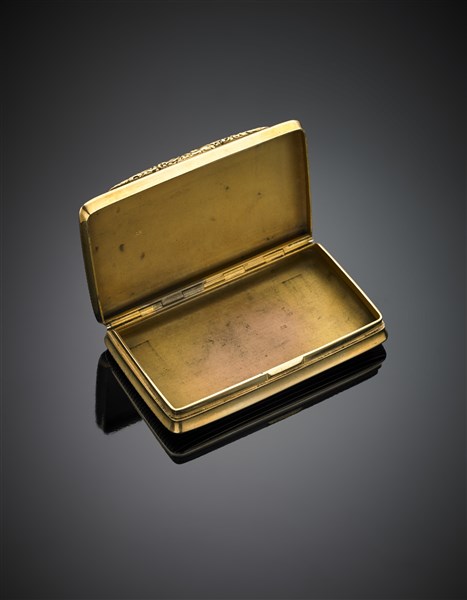 Yellow grooved gold snuff box with floral thumbpiece, g 103.21, length cm 8, width cm 4.70, h cm 1.10 circa.