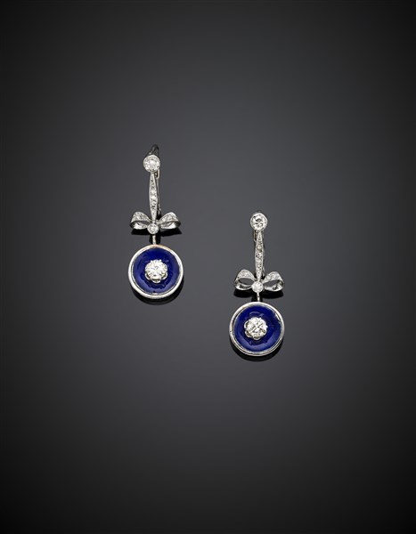 Orecchini pendenti in oro bianco e diamanti rifiniti con smalto blu per complessivi ct. 0,70 circa, g 7,16, lungh. cm 3,20 circa. (difetti)