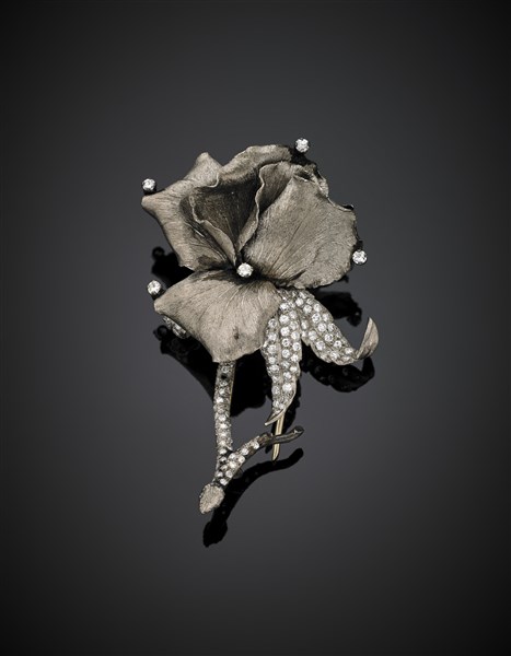 Broche floreale in platino e diamanti per complessivi ct. 2,20 circa, g 45,73,