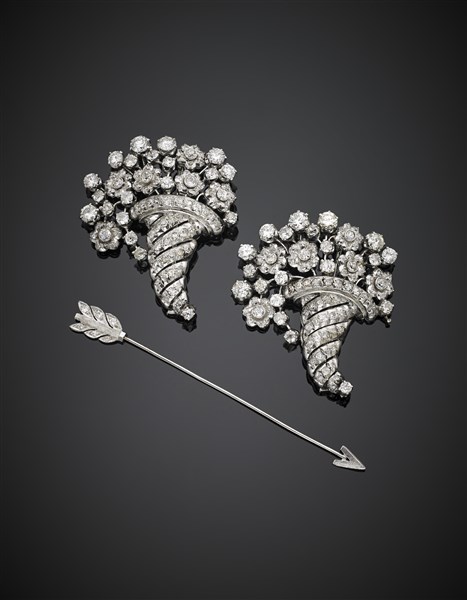 Doppia broche in platino e diamanti per complessivi ct. 9,00 circa a guisa di cornucopie e fiori, unite a uno spillone a guisa di freccia, ogni broche lungh. cm 4.70 circa g 32,99. (lievi difetti)