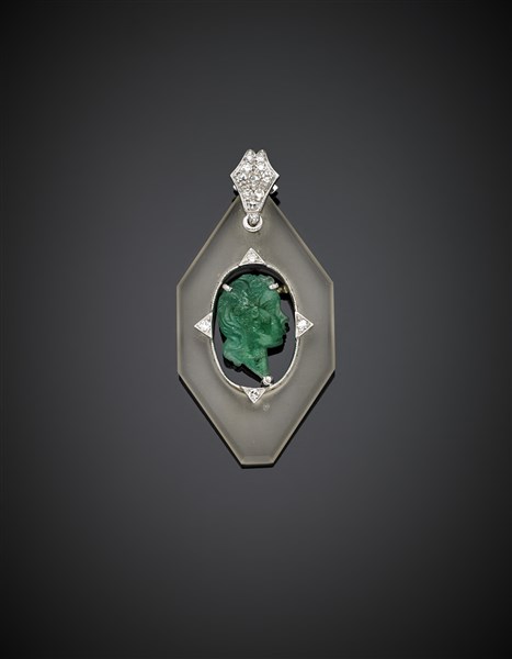 Quartz and diamond white gold pendant and a central emerald carved with a youth profile, g 8.14, length cm 5 circa.