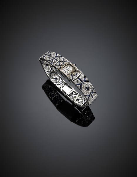 Orologio da polso da donna in platino con diamanti oldmine, zaffiri rotondi e calibré in parte sintetici, g 35,99, lungh. cm 17, largh. cm 1,30 circa. (difetti e mancanze)