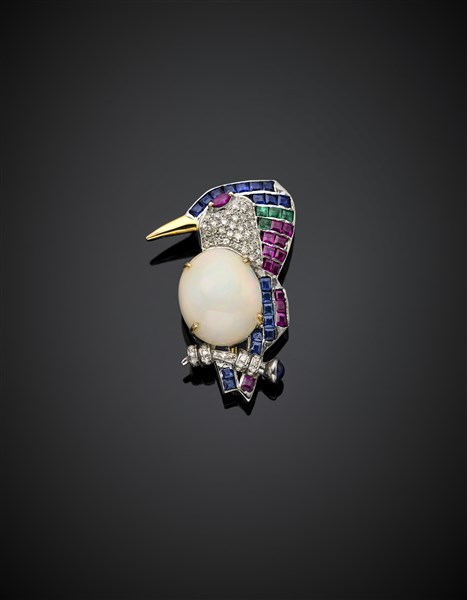 Oval mm 17.30x14.40x9.50 noble opal, diamond, ruby, sapphire and emerald silver and 14K gold kingfisher pendant/brooch, g 9.89, length cm 4.10 circa. French import marks.