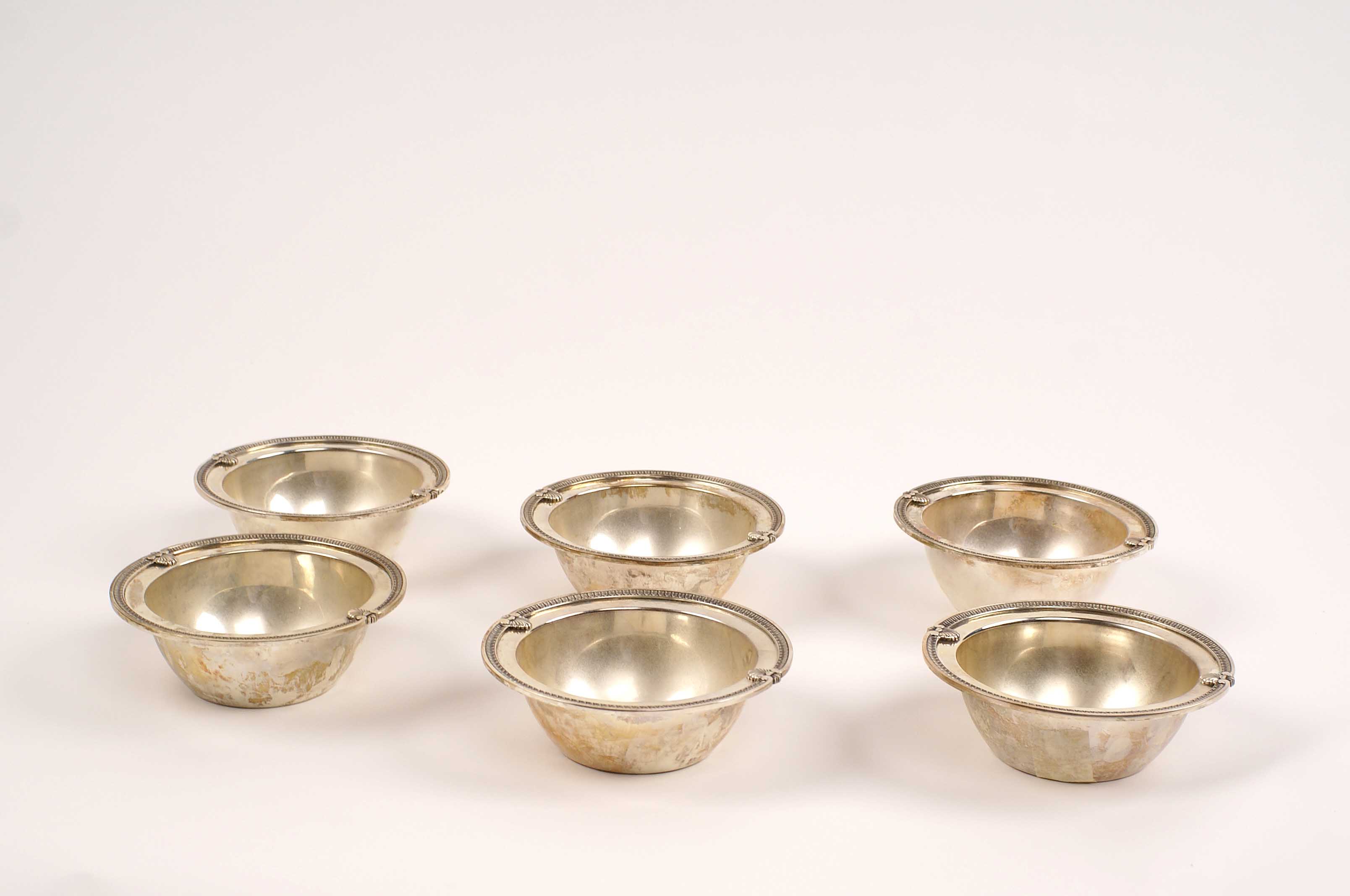 SEI COPPETTE IN ARGENTO FIRMATE SERRA ROMA vecchia manifattura Con profilo decorato a motivo di palmette, d. cm. 13,5 Peso 1110 gr.