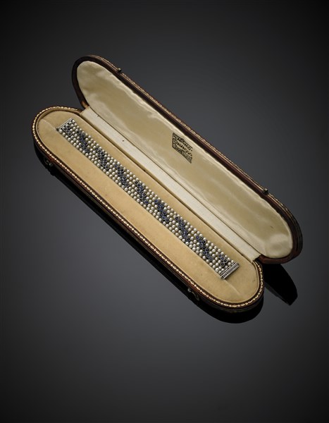 Five strand seedpearl with round sapphire wave pattern platinum bracelet, g 18.06, length cm 17.50 circa. Attributed to the Ravasco workshop. In Giacomo Ravasco Gioielliere case