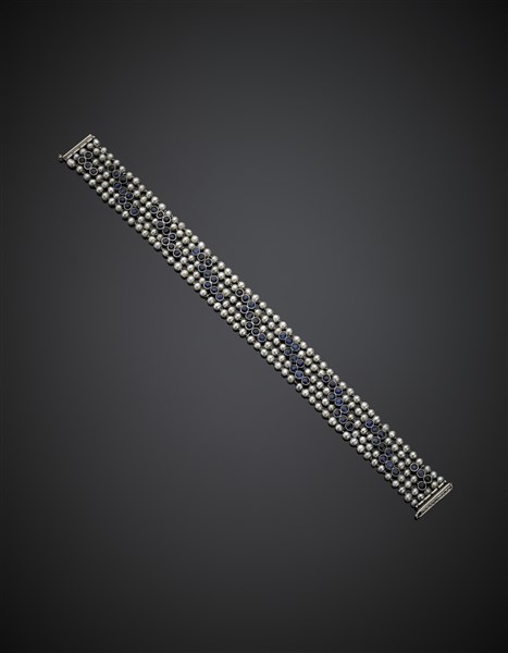 Bracciale in platino a cinque fili di piccole perle interrotti da motivi a onde con zaffiri rotondi, g 18,06, lungh. cm 17,50 circa. Attribuito alla Bottega Ravasco. In scatola Giacomo Ravasco gioielliere