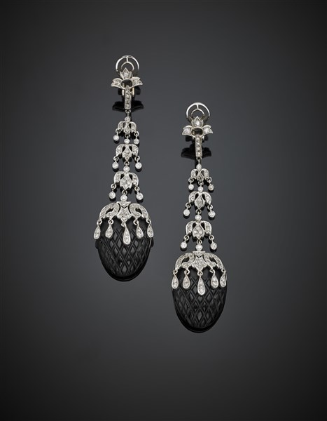 Orecchini pendenti in oro bianco, resina nera scolpita e diamanti, g 25,31, lungh. cm 7,20 circa.