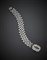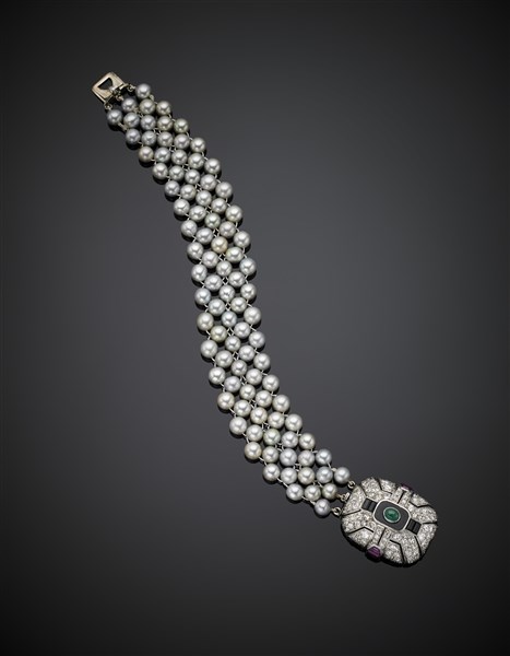 Bracciale intrecciato in perle coltivate rifinito con chiusura in oro bianco, diamanti per complessivi ct. 2,70 circa, rubini calibré, onice e smeraldo cabochon, g 42,57, lungh. cm 20,50 circa.