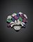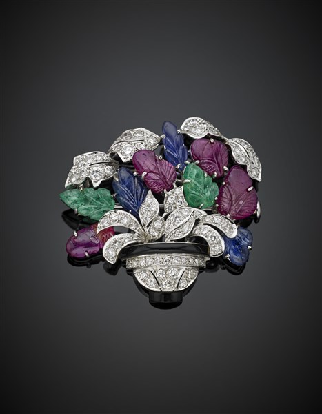 Spilla a vaso in platino con foglie di smeraldi, rubini e zaffiri scolpiti, oni