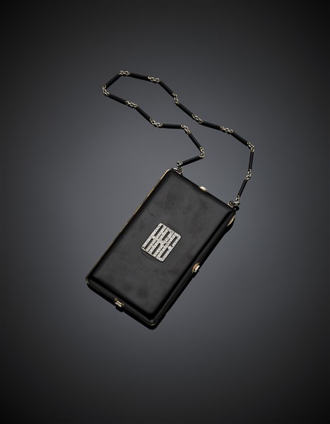 Yellow 14K gold and black enamel minaudière with inside mirror, platinum and rose cut diamonds details, inside inscription Helen R Goldman, held by a short chain with enamel spacers, gross g 131.66, length cm 8.50, width cm 4.70, h cm 0.90 circa. Signed Charlton & Co. In original Charlton & Co , 634 Fifth Avenue, New York case (defects and losses)